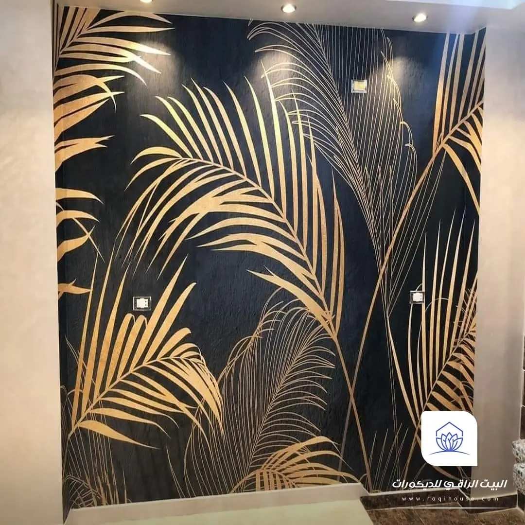 - اللمسات الذهبية الهندسية: وهي تصاميم بخطوط هندسية رفيعة بلون ذهبي على خلفيات رمادية أو كحلية. ويناسب هذا النوع الصالات والمجالس العصرية.